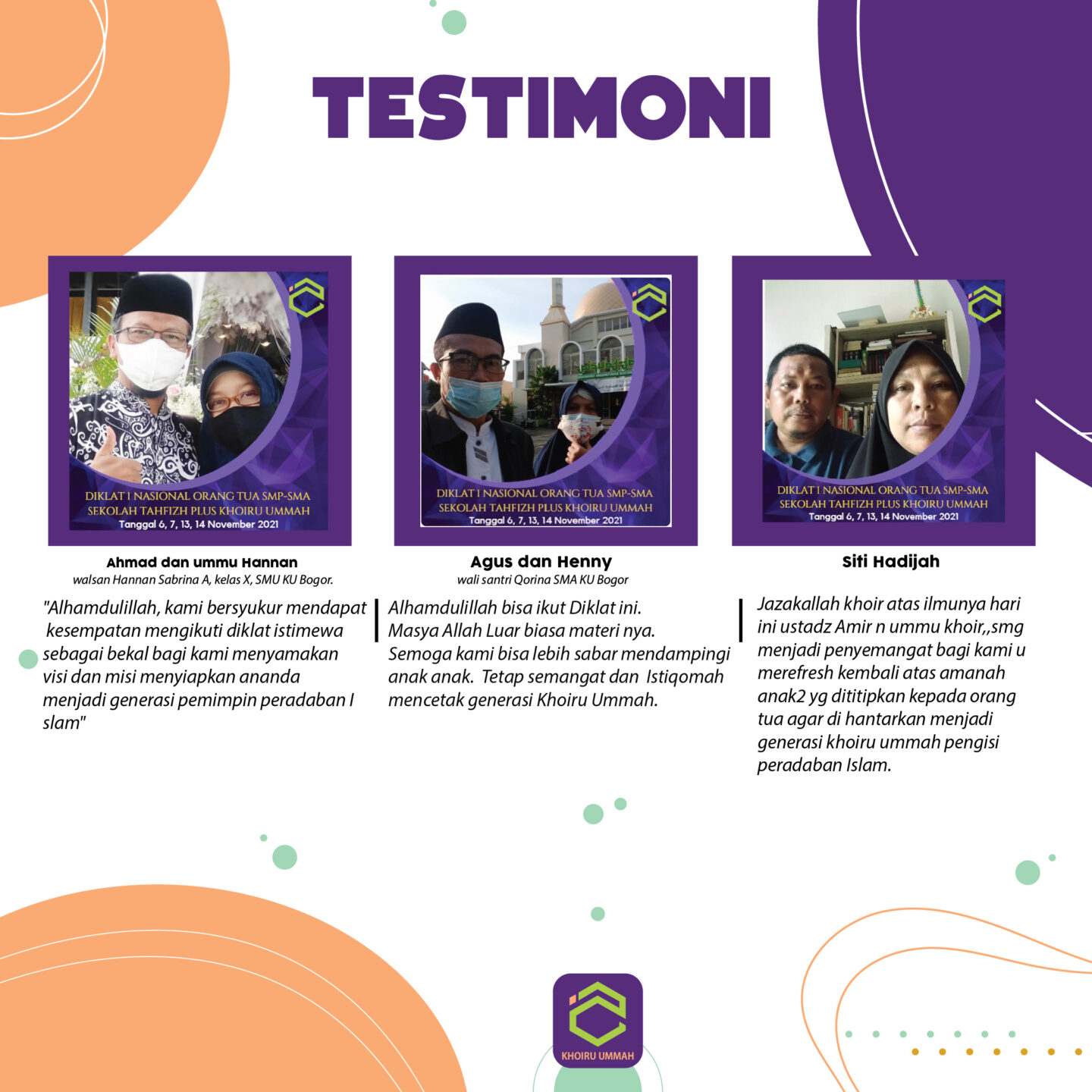 Alhamdulillah hari ini, Ahad 12 November 2021 telah selesai dilaksanakan Diklat 1 Nasional Orang Tua SMP-SMA Sekolah Tahfidz Plus Khoiru Ummah. Diklat yang berlangsung selama 4x pertemuan sejak tanggal 6-14 November 2021 ini dihadiri oleh 93 orang tua siswa tingkat SMP dan SMA.