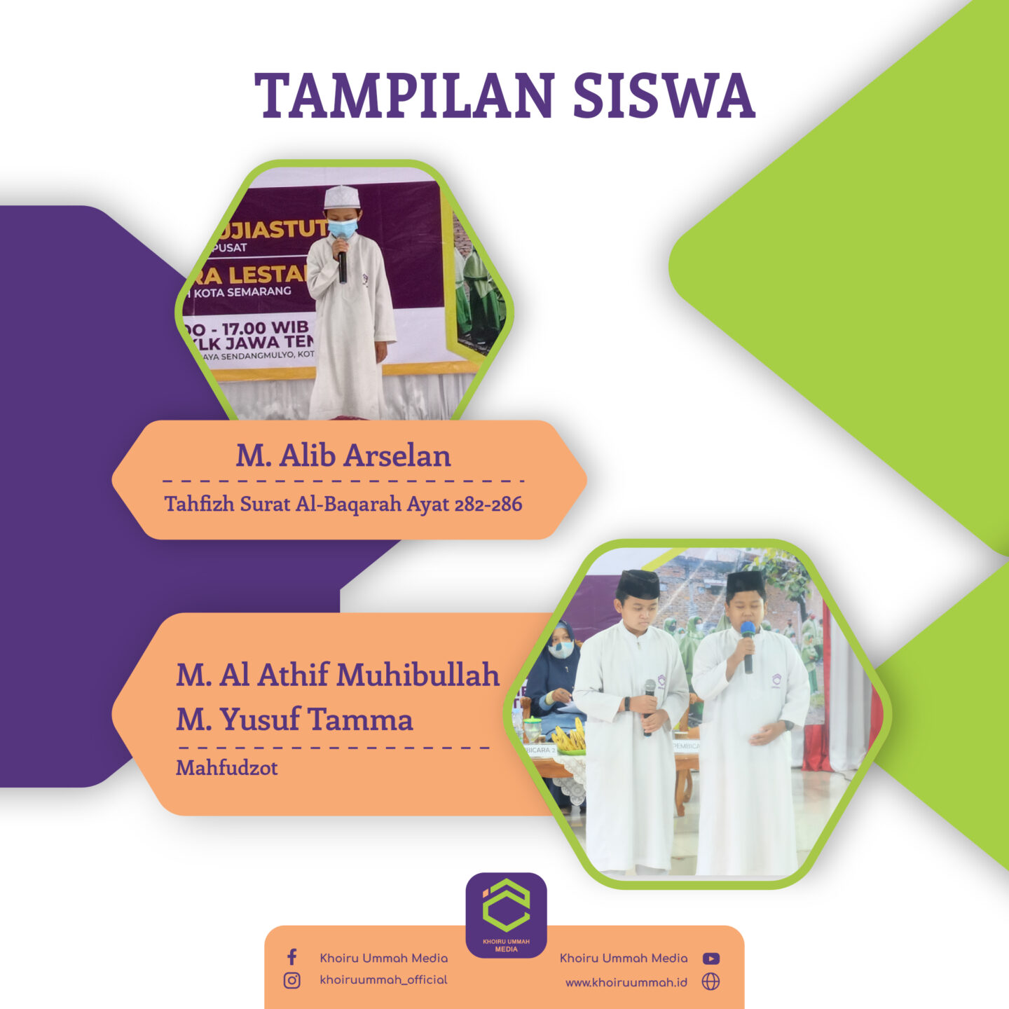 Selanjutnya di hari kedua, diklat 1 Sekolah Tahfizh Plus Khoiru Ummah Semarang diawali dengan tampilan tahfizh dari dua orang siswa kelas 1 yaitu ananda Muhammad Amirul Insan dan ananda Annisa Hanifah. Tahfizh surat Al A’la ditampilkan oleh ananda Muhammad Amirul Insan sedangkan tahfizh surat Asy-Syams ditampilkan oleh ananda Annisa Hanifah. Setelah tampilah tahfizh, dilanjutkan dengan tampilan micro teaching pelajaran tahsin (ghorib) oleh perwakilan ananda dari kelas 5 dan 6 yang dipandu oleh ustadzah Indra Lestari. Tak ketinggalan tampilan mahfudzot oleh ananda Muhammad Al Athif Muhibullah dan ananda Muhammad Yusuf Tamma dari kelas 6. Maasya Allah, luar biasa keberanian dan prestasinya.