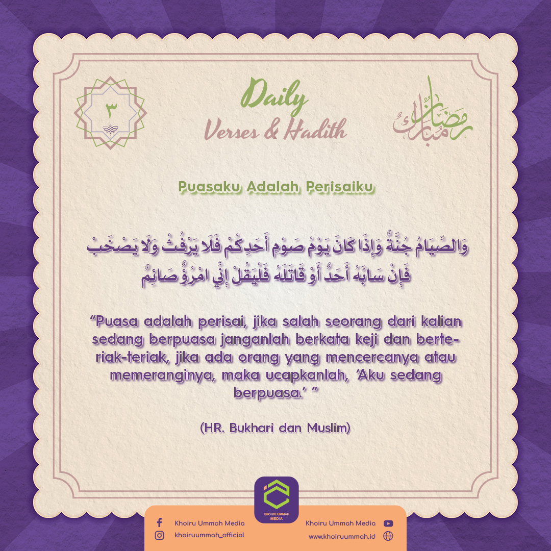 “Puasa adalah perisai, jika salah seorang dari kalian sedang berpuasa janganlah berkata keji dan berteriak-teriak, jika ada orang yang mencercanya atau memeranginya, maka ucapkanlah, ‘Aku sedang berpuasa” (H.R. Bukhari dan Muslim).